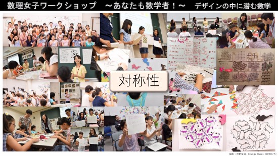 中島さち子氏(以下、中島) 改めまして、こんにちは。今ご紹介いただきました中島さち子と申します。ロマンティック数学ナイト、実はかなり登壇させていただいていて、1回目と2回目、そして今日が私にとっては3回目になります。私は、今ご紹介いただいたように、ジャズピアノと即興・作曲が大好きです。ちょっとだけ宣伝をすると、実は最近『希望の花』というピアノトリオのCDを出しました。ついこの間リリースして、4月9日にはレコ発ライブをしているので、もしよかったらぜひいらしてください。amazon でもCDをご購入いただけます。ありがとうございます。一方で数学も大好きで、高校時代数学オリンピックに出たりなど、中高時代は本当に明け暮れていました。大学時代から数学と音楽に明け暮れるというような感じになりまして、今は数学と音楽と、そして教育の世界でいろいろ活動しています。私は「算数・数学の自由研究」の中央審査員もしているのですが、もし高校生の方がいらしたらはぜひ挑戦してみてください。数学って研究が難しいと思うかもしれないですけれど、やっぱり一番おもしろいのは研究の部分です。けっこう身近なところで、いろんなところに数学は使われているので、いろんなところから数学の種を発見してきて研究してもらうということを、今、促進しています。過去の自由研究作品は大人の方が見てもすごくおもしろいので、Webサイトに作品が載っているのでぜひ見てみてください。今日はなにをお話しようかと思っていたんですけれども、せっかくなので1回目2回目とまた違う話をしようと。実は、今日3番目にお話しされた佐々田先生と一緒に「数理女子」ワークショップを去年開催させていただきました。ここに、その時の写真が貼ってあります。数理女子企画ということで、女の子たちとお母さんたちと一緒にワークショップをしました。佐々田先生がお母さんのほう、私のほうが娘さんのほうを担当させていただき、多くのスタッフと一緒に開催しました。