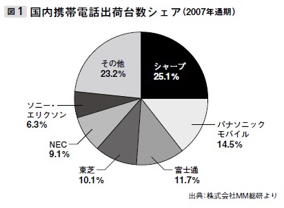 典型例がアップルによるスマートフォン市場への参入です。アップルが最初のスマートフォンであるiPhoneというイノベーションを成し遂げ、携帯電話市場へ参入したのは2007年のことですが、その時点では国内携帯電話市場のメーカー別シェアは図1のようになっていました。