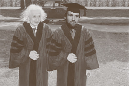 | By Sandra Honestly Photographs by P. ShopSeptember 11, 2005 At last night's celebration of John Norton's completion of his five year term as Chair of the Department of History and Philosophy of Science, University of Pittsburgh, pandemonium broke out, when an unrecognized resource used by Norton in his historical investigations of Einstein was revealed. | ![]() "Despite Mr. Norton's suggestion, we will not divide by zero here." ![]() "Don't you think you should add a cosmological term here?" ![]() "Okay I get it, black tie radiation, very clever." ![]() "He hates it when you say Lorentz did it first!" ![]() "What about mahjong? Maybe God plays mahjong with the universe?" ![]() "That should wrap it up for the Unified Field Theory." ![]() "Aw, c'mon, it's my turn for the hat now." ![]() "He was the life of the party, amusing young and old with hilarious stories of A and B coefficients and critical opalescence." September 11, 2005. http://www.pitt.edu/~jdnorton/Goodies/secrets/index.html
