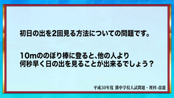 初日の出を2回見る方法についての問題です。10mののぼり棒に登ると、他の人より何秒早く日の出を見ることが出来るでしょう?(平成30年度 灘中学校入試問題・理科-改題)