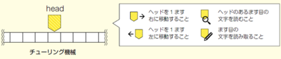 チューリング機械の驚嘆すべきところは, その極端なまでの単純さです。1本のテープと読み取りヘッドが1つあるだけです。そして出来ることは, ヘッドを右か左に1文字分移動することと, テープに文字を書き込むこと, そして文字を読み取ることのみです。これだけの機構で, アルゴリズムすべてが実現できるのです。