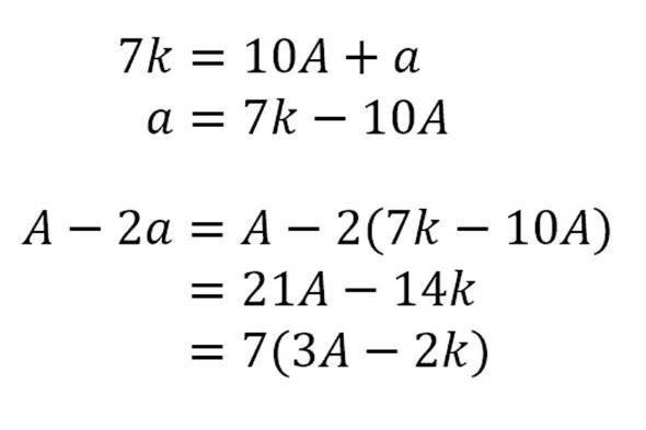 「ある数」10A+aが7の倍数ならば、等式7k=10A+a(kは自然数)が成立して、aについて解くとa=7k-10A。これをA-2aに代入して整理すると21A-14kとなり、14kも21Aも7で割り切れるから、A-2aは7で割り切れる。