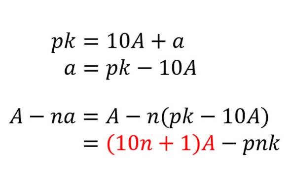 さて、どうしてこのようになるかを説明する。「ある数」が、0~9の整数aと任意の自然数Aから「10A+a」と表せるとする。このとき、一の位の数に2をかけて、残った数から引いた結果は「A-2a」となる。