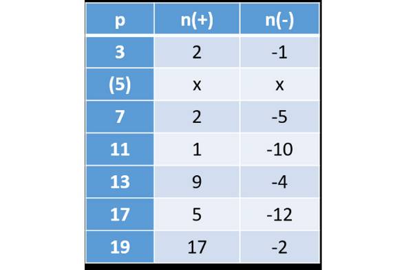 参考までに、代表的な素数pに対するnの例を示しておく。p=3はn=-1で成り立つが、これは冒頭で挙げた「全ての桁を足し合わせる」と同じことになる。