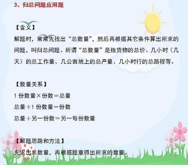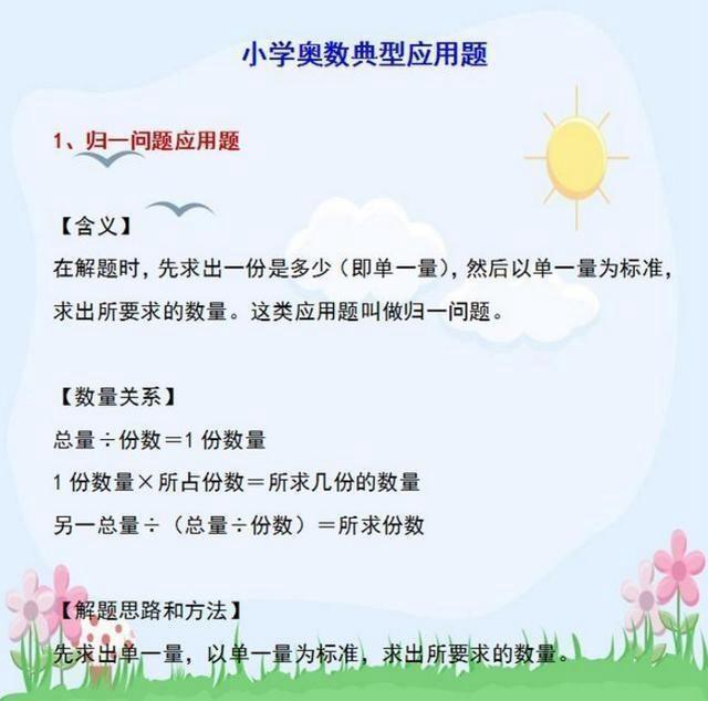 正所谓“得应用题得天下”,在我们的一个数学学习过程中,我们应用题的一个考察可以说是占据了我们数学学习的半壁江山,不管我们的一个小升初考试,还是平时的一个考试中,我们都能看见它的一个身影,因此,对于我们孩子来讲,要想在小学阶段取得一个好的数学成绩,那么就一定要掌握好我们应用题这块的一个内容。