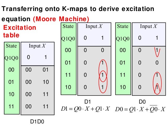 - 7. Assigning state variable to obtain Mealy machinetransition/output table Moore machine Transition/output table Transition/output table State Input X State Input X Output Q1Q0 0 1 Q1Q0 0 1 Z 00 00,0 01,0 00 00 01 0 01 00,0 10,0 01 00 10 0 10 00,0 10,1 10 00 11 0 11 00 11 1 Next State Q1*Q0*, ZEncodingA = 00, B = Choosing D Next State Q1*Q0*01 type flip flop