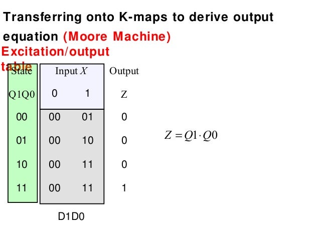 - 13. Transferring onto K-maps to derive outputequation (Moore Machine)Excitation/outputtable State Input X Output Q1Q0 0 1 Z 00 00 01 0 01 00 10 0 Z = Q1⋅ Q0 10 00 11 0 11 00 11 1 D1D0