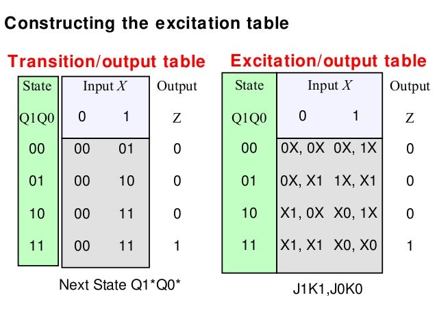 - 16. Constructing the excitation tableTransition/output table Excitation/output table State Input X Output State Input X Output Q1Q0 0 1 Z Q1Q0 0 1 Z 00 00 01 0 00 0X, 0X 0X, 1X 0 01 00 10 0 01 0X, X1 1X, X1 0 10 00 11 0 10 X1, 0X X0, 1X 0 11 00 11 1 11 X1, X1 X0, X0 1 Next State Q1*Q0* J1K1,J0K0