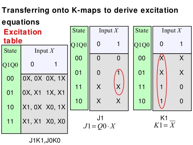 - 17. Transferring onto K-maps to derive excitationequationsExcitation State Input X State Input Xtable Q1Q0 0 1 Q1Q0 0 1State Input X 00 0 0 00 X XQ1Q0 0 1 01 0 1 01 X X 00 0X, 0X 0X, 1X 11 X X 11 1 0 01 0X, X1 1X, X1 10 X X 10 1 0 10 X1, 0X X0, 1X J1 K1 11 X1, X1 X0, X0 J 1 = Q0 ⋅ X K1 = X J1K1,J0K0