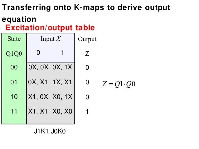 - 19. Transferring onto K-maps to derive outputequation Excitation/output table State Input X Output Q1Q0 0 1 Z 00 0X, 0X 0X, 1X 0 01 0X, X1 1X, X1 0 Z = Q1⋅ Q0 10 X1, 0X X0, 1X 0 11 X1, X1 X0, X0 1 J1K1,J0K0
