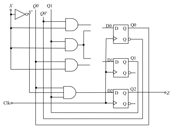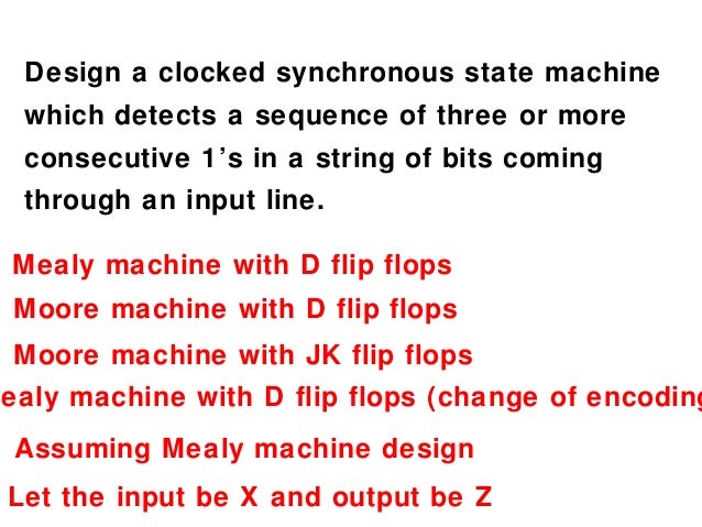 - 2. Design a clocked synchronous state machine which detects a sequence of three or more consecutive 1’s in a string of bits coming through an input line.Mealy machine with D flip flopsMoore machine with D flip flopsMoore machine with JK flip flopsealy machine with D flip flops (change of encodingAssuming Mealy machine designLet the input be X and output be Z