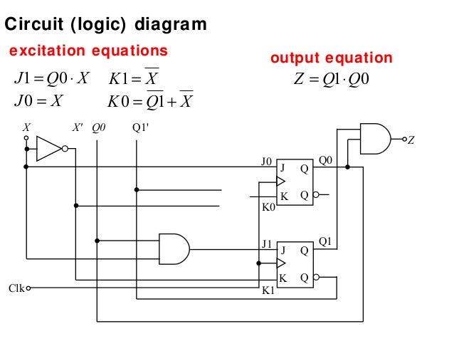 - 20. Circuit (logic) diagramexcitation equations output equation J 1 = Q0 ⋅ X K1 = X Z = Q1⋅ Q0 J0 = X K 0 = Q1 + X X X Q0 Q1 Z J0 Q0 J Q K Q K0 J1 Q1 J Q K QClk K1
