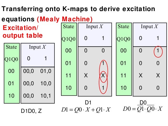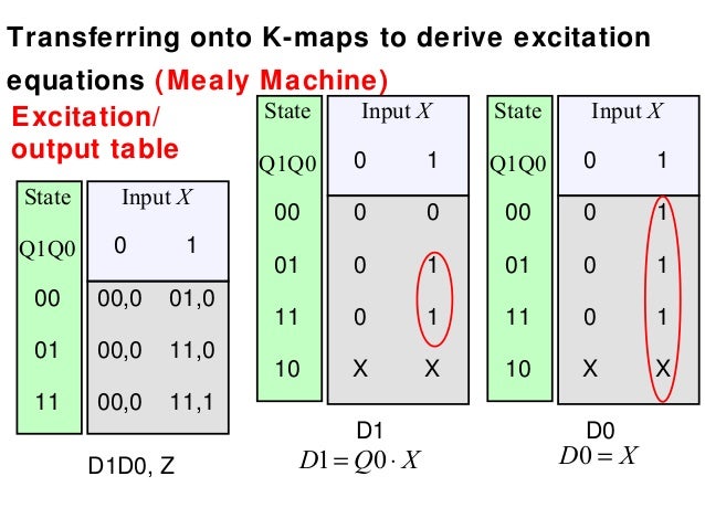 - 24. Transferring onto K-maps to derive output equation (Mealy Machine)Excitation/output State Input Xtable Q1Q0 0 1 State Input X 00 0 0 Q1Q0 0 1 01 0 0 00 00,0 01,0 11 0 1 01 00,0 11,0 10 X X 11 00,0 11,1 Z D1D0, Z Z = Q1 ⋅ X