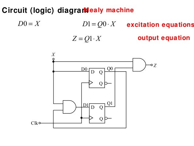 - 25. Circuit (logic) diagram Mealy machine D0 = X D1 = Q0 ⋅ X excitation equations Z = Q1 ⋅ X output equation X Z D0 Q0 D Q Q D1 D Q Q1 Q Clk