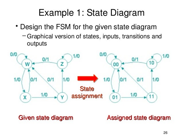 - 26. Example 1: State Diagram• Design the FSM for the given state diagram – Graphical version of states, inputs, transitions and outputs W Z State X Y assignmentGiven state diagram Assigned state diagram 26
