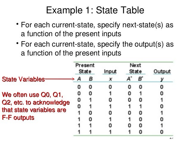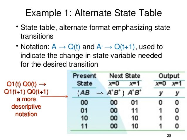 - 27. Example 1: State Table • For each current-state, specify next-state(s) as a function of the present inputs • For each current-state, specify the output(s) as a function of the present inputsState VariablesWe often use Q0, Q1,Q2, etc. to acknowledgethat state variables areF-F outputs 27