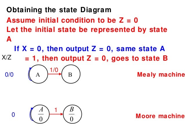 - 3. Obtaining the state Diagram Assume initial condition to be Z = 0 Let the initial state be represented by state A If X = 0, then output Z = 0, same state AX/Z = 1, then output Z = 0, goes to state B 1/00/0 A B Mealy machine A 1 B 0 Moore machine 0 0