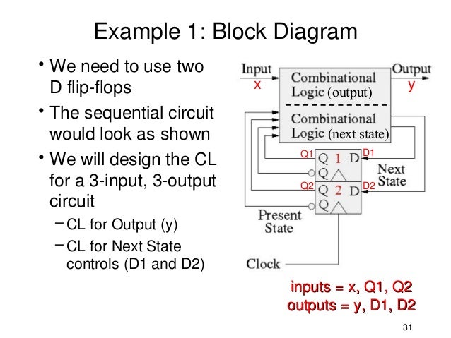 - 31. Example 1: Block Diagram• We need to use two D flip-flops x y (output)• The sequential circuit would look as shown (next state) Q1 D1• We will design the CL for a 3-input, 3-output Q2 D2 circuit – CL for Output (y) – CL for Next State controls (D1 and D2) inputs = x, Q1, Q2 outputs = y, D1, D2 31