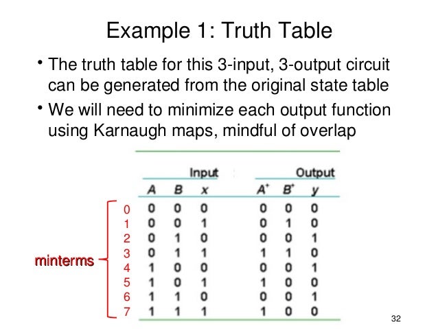 - 32. Example 1: Truth Table• The truth table for this 3-input, 3-output circuit can be generated from the original state table• We will need to minimize each output function using Karnaugh maps, mindful of overlap 0 1 2 3minterms 4 5 6 7 32