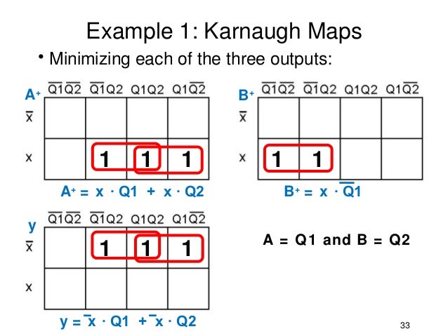 - 33. Example 1: Karnaugh Maps • Minimizing each of the three outputs:A+ B+ 1 1 1 1 1 A+ = x ∙ Q1 + x ∙ Q2 B+ = x ∙ Q1y A = Q1 and B = Q2 1 1 1 y = x ∙ Q1 + x ∙ Q2 33