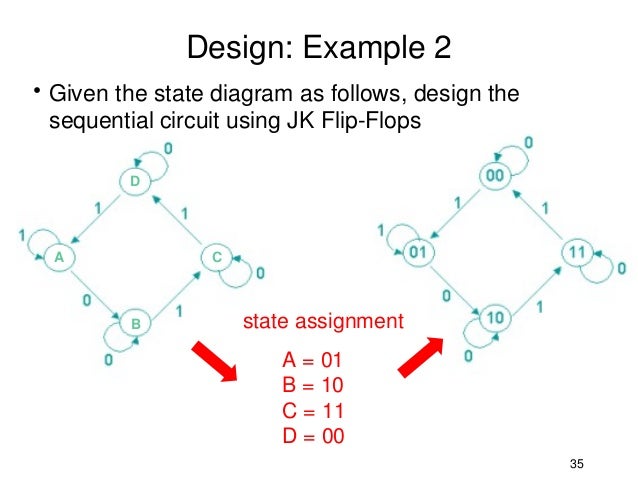 - 35. Design: Example 2• Given the state diagram as follows, design the sequential circuit using JK Flip-Flops D A C B state assignment A = 01 B = 10 C = 11 D = 00 35