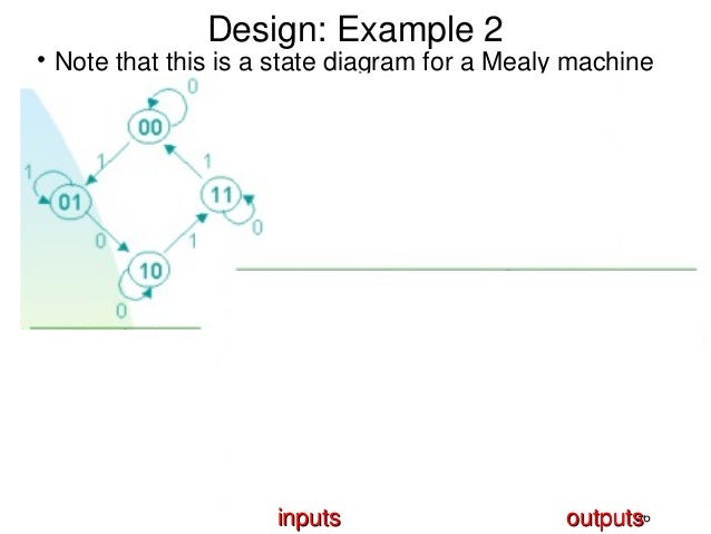 - 36. Design: Example 2• Note that this is a state diagram for a Mealy machine inputs outputs 36