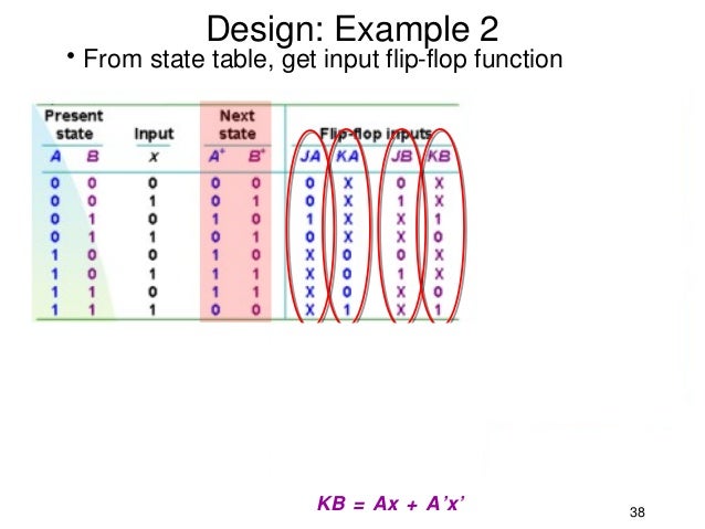 - 38. Design: Example 2• From state table, get input flip-flop function KB = Ax + A’x’ KB = Ax + A’x’ 38