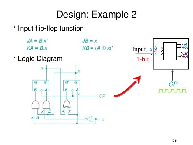 - 39. Design: Example 2• Input flip-flop function JA Input, x A B KA x JB• Logic Diagram 1-bit KB CP x x′ B A x x B 39