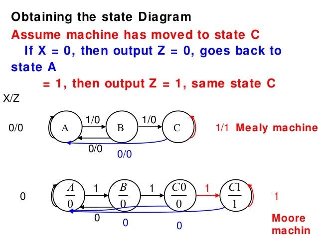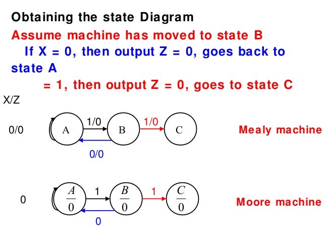 - 4. Obtaining the state Diagram Assume machine has moved to state B If X = 0, then output Z = 0, goes back to state A = 1, then output Z = 0, goes to state CX/Z 1/0 1/00/0 A B C Mealy machine 0/0 A 1 B 1 C 0 Moore machine 0 0 0 0