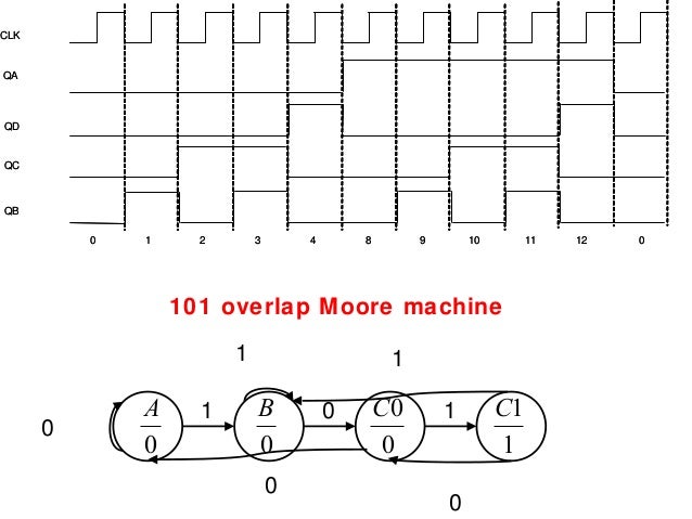 - 40. CLKQAQDQCQB 0 1 2 3 4 8 9 10 11 12 0 101 overlap M oore machine 1 1 A 1 B 0 C0 1 C1 0 0 0 0 1 0 0