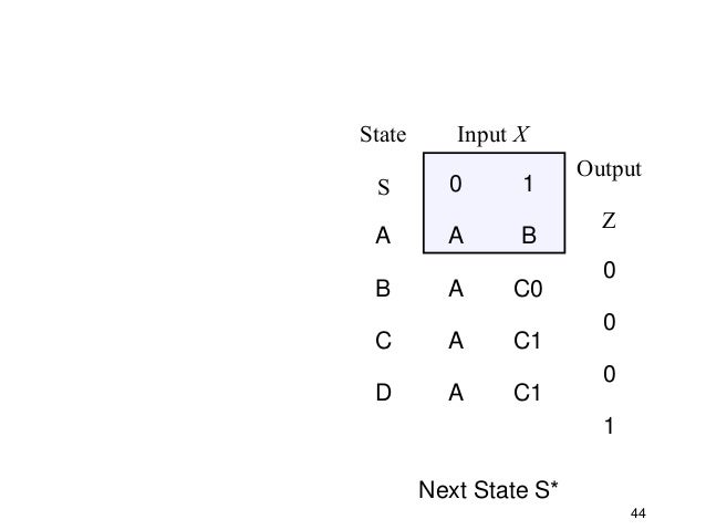 - 44. State Input X Output S 0 1 Z A A B 0 B A C0 0 C A C1 0 D A C1 1 Next State S* 44