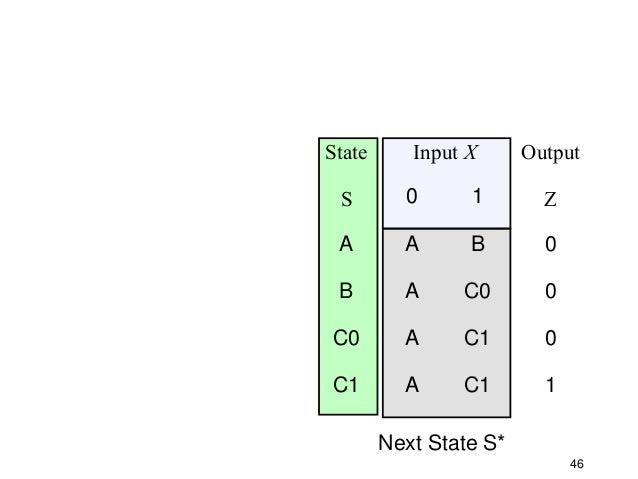- 46. State Input X Output S 0 1 Z A A B 0 B A C0 0C0 A C1 0C1 A C1 1 Next State S* 46