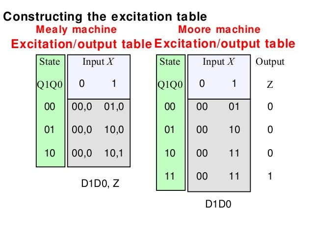 - 8. Constructing the excitation table Mealy machine Moore machine Excitation/output table Excitation/output table State Input X State Input X Output Q1Q0 0 1 Q1Q0 0 1 Z 00 00,0 01,0 00 00 01 0 01 00,0 10,0 01 00 10 0 10 00,0 10,1 10 00 11 0 11 00 11 1 D1D0, Z D1D0